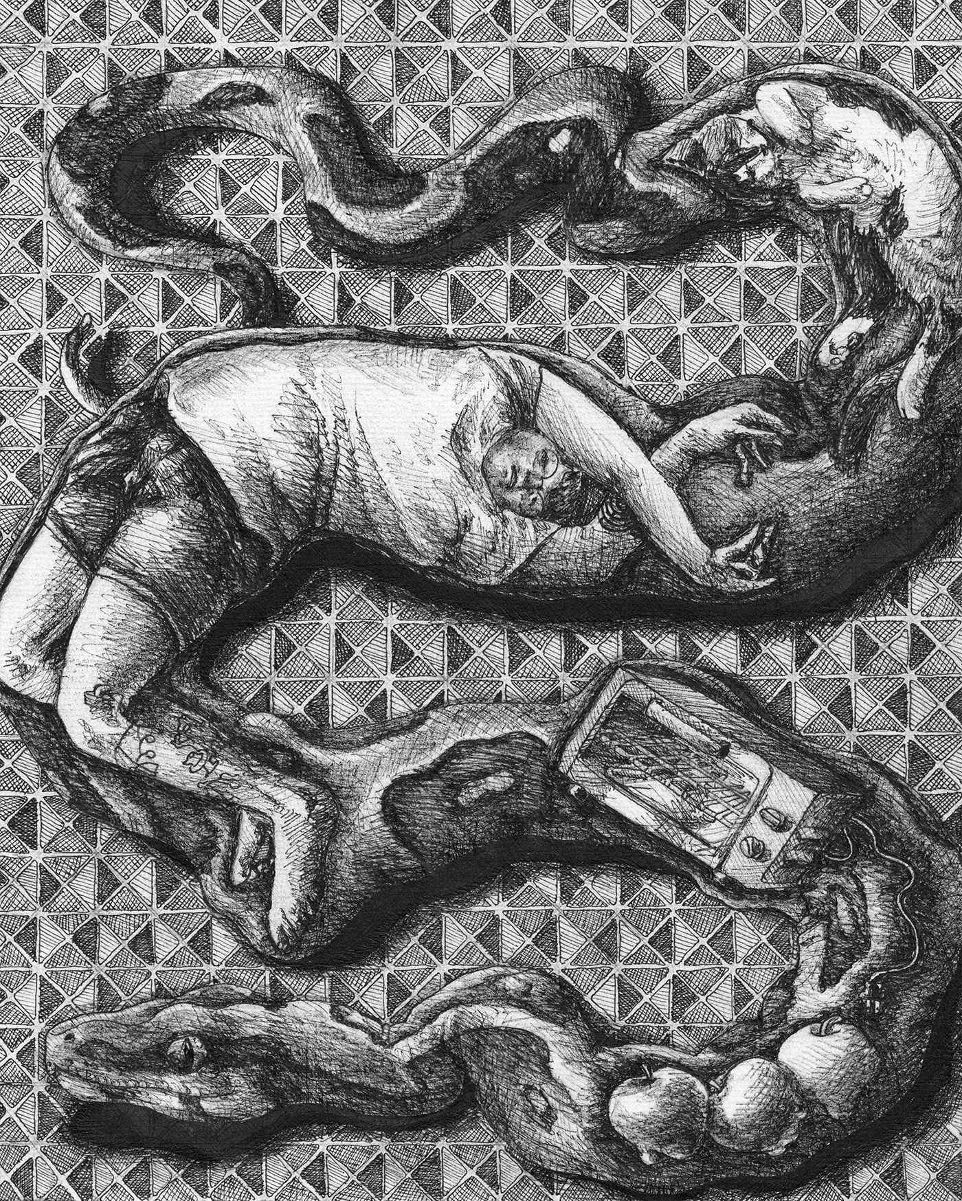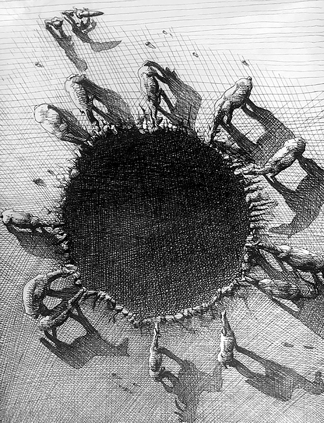 inferno is an interdisciplinary body of work that combines the structure of dante alighieri's divine comedy with imagery from my vivid nightmares and reflections on mental illness. including intricate ink drawings, artist books, sculptures, poetry, and games, inferno acts as a mirror for both artist and audience to question how we can go on while the world seems to be unmaking itself – caught in a state of collapse like an unyielding engine. utilizing my dream journals as source material , inferno creates a narrative that humanizes the working class struggle, defined by a steady decline in mental and physical health and financial independence, and complicated with the unwavering determination to persevere.