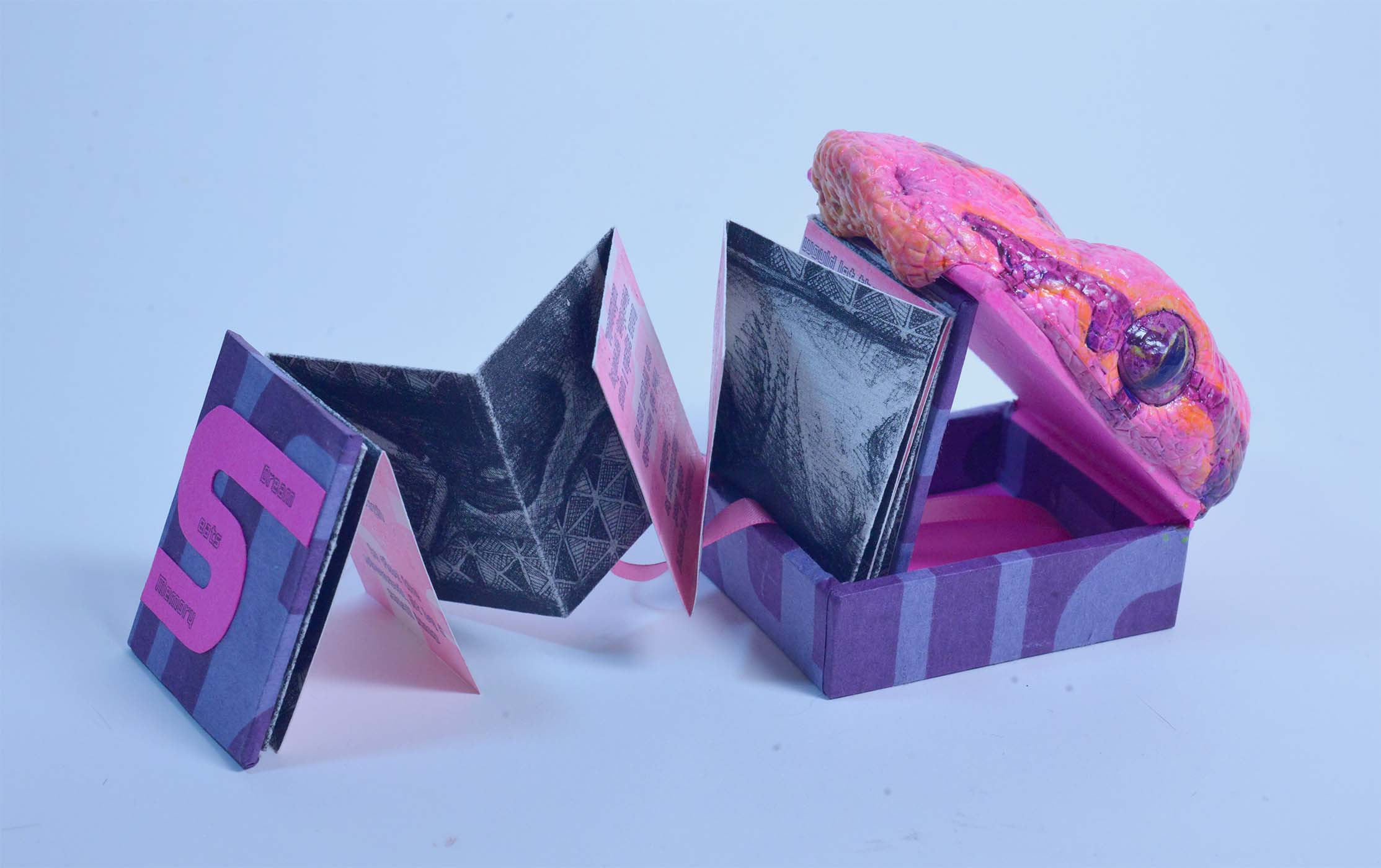 Meander book, letterpress print, inkjet print on paper, apoxie clay, acrylic paint, silk ribbon, edition of 18
