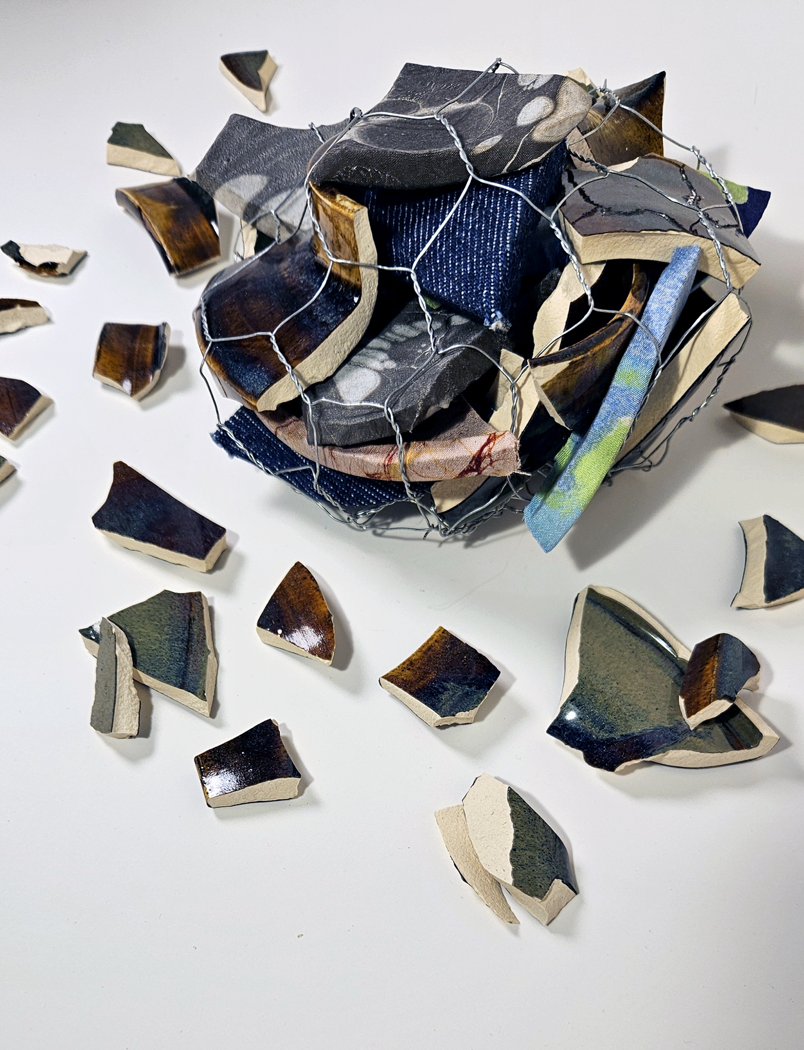 this work is a manifestation of the effects of grief and loss on my mind, body, and spirit. moral distress, the inspiration for this piece, does not exist in isolation. it mixes, compounds, amplifies, and distorts all forms of grief and loss experienced in my life. over time, textiles have been a site of self-exploration. in this work, silk and cotton wrap pieces of ceramic to represent different times when grief and loss were experienced. poultry wire holds them together, imprisoning the pieces of ceramic to form a shape against their will. how do we continue to operate in a world that opposes our moral compass? and how do we move through grief when it is disenfranchised? through this piece, i aim not to resolve these questions, but to hold space for them and to invite viewers to sit with the complexity and power of grief alongside me.
